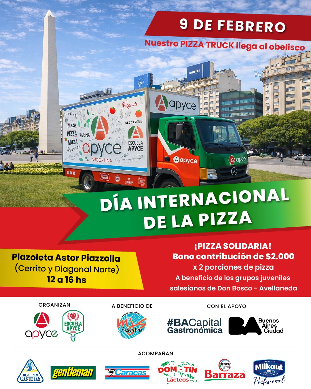 La cita es el lunes 9 de febrero, de 12 a 16 horas, en Plaza Astor Piazzolla (Cerrito y Diagonal Norte). Allí, APYCE desplegará su imponente camión cocina autosustentable de 11 toneladas, donde una decena de maestros pizzeros elaborará 5.000 porciones de pizza a la vista del público.