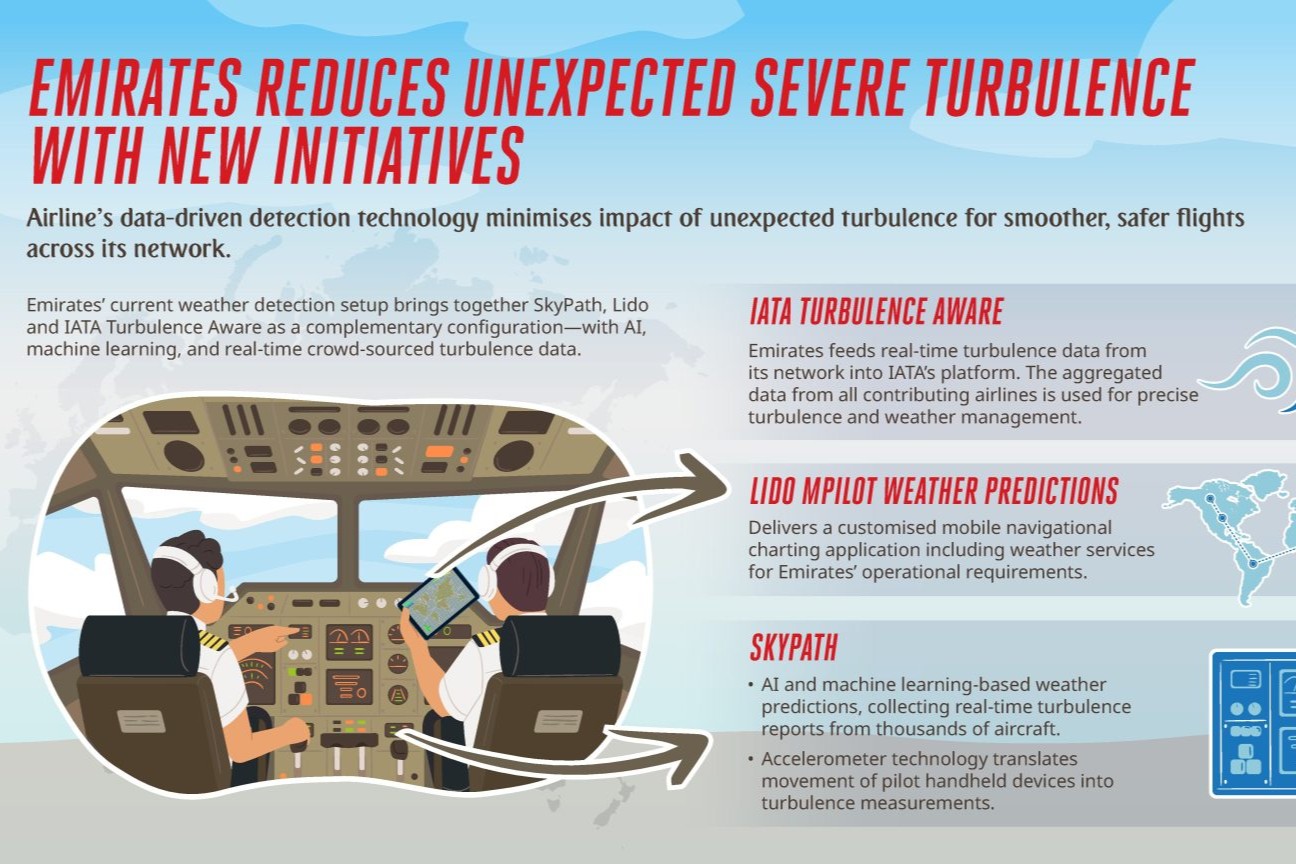 Lido mPilot, fruto de la colaboración con Lufthansa Systems, proporciona datos en tiempo real sobre nubes, convección y predicciones de formación de hielo. Mientras que la participación en Turbulence Aware de IATA permite a Emirates contribuir y consumir datos globales de turbulencias en tiempo real.