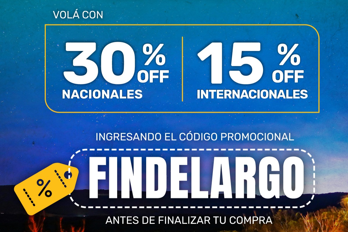 La oferta es por tiempo limitado. Está disponible desde hoy, 21 de noviembre, y solo hasta el lunes 24. Para acceder a los descuentos Flybondi fin de semana largo, los pasajeros deben ingresar a la web de la aerolínea y usar el código promocional FINDELARGO al momento de pagar.