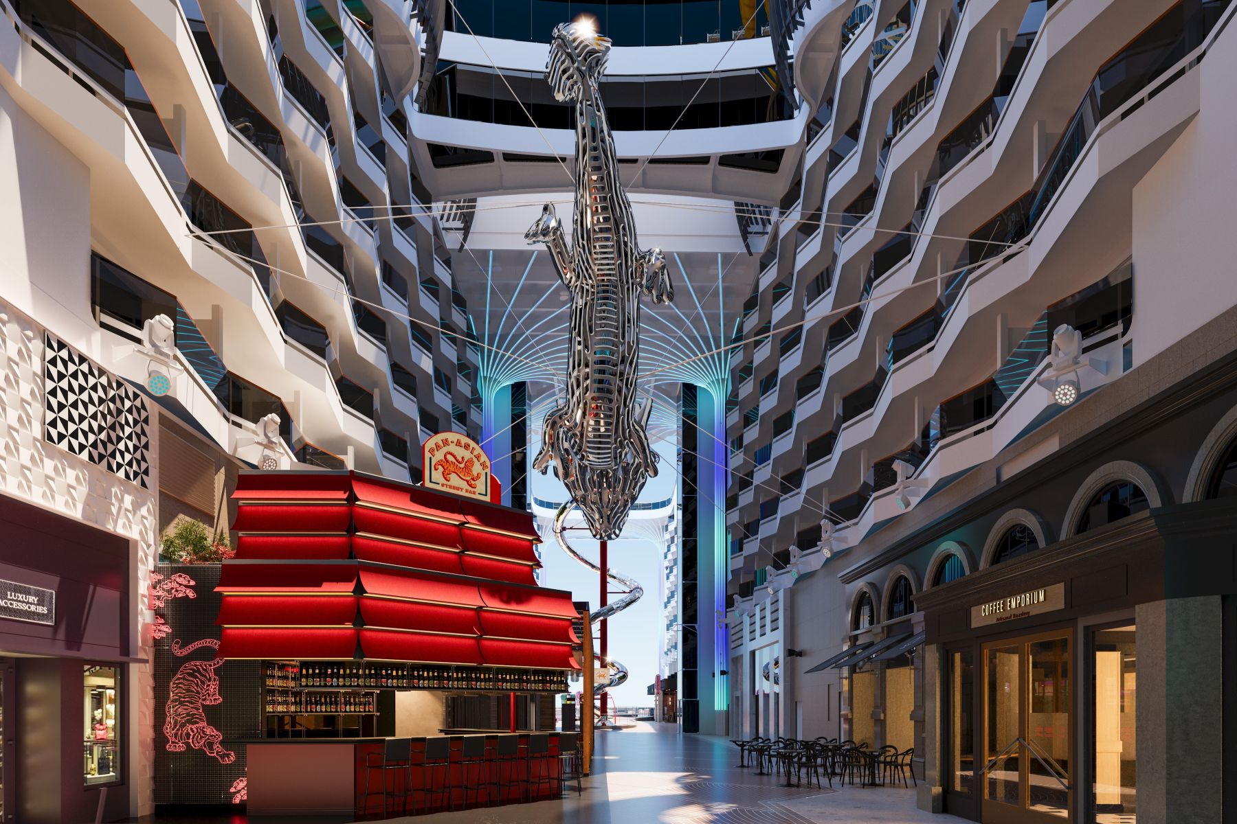 El buque, perteneciente a la innovadora Clase World, incorporará detalles que homenajean la cultura asiática. La joya de la corona será una impresionante escultura de un dragón de acero inoxidable de 12 metros, suspendida a 10 metros de altura en el World Promenade y adornada con casi 700 espejos y 3.000 luces LED.